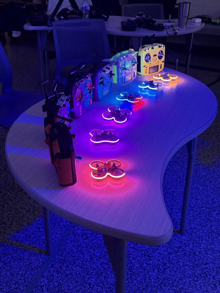 FPV (First-Person View) racing is a high-speed, adrenaline-filled sport where pilots fly drones using real-time video feeds from onboard cameras. Wearing FPV goggles, racers experience the thrill of flying as if they were inside the drone, weaving through gates and obstacles at incredible speeds. Our league focuses on two main types of racing: Tiny Whoops—small, lightweight drones perfect for indoor racing in the winter—and 5″ quadcopters, which offer fast, dynamic outdoor racing in the summer. Whether you’re a beginner or an experienced pilot, FPV racing is an exciting mix of skill, technology, and competition!